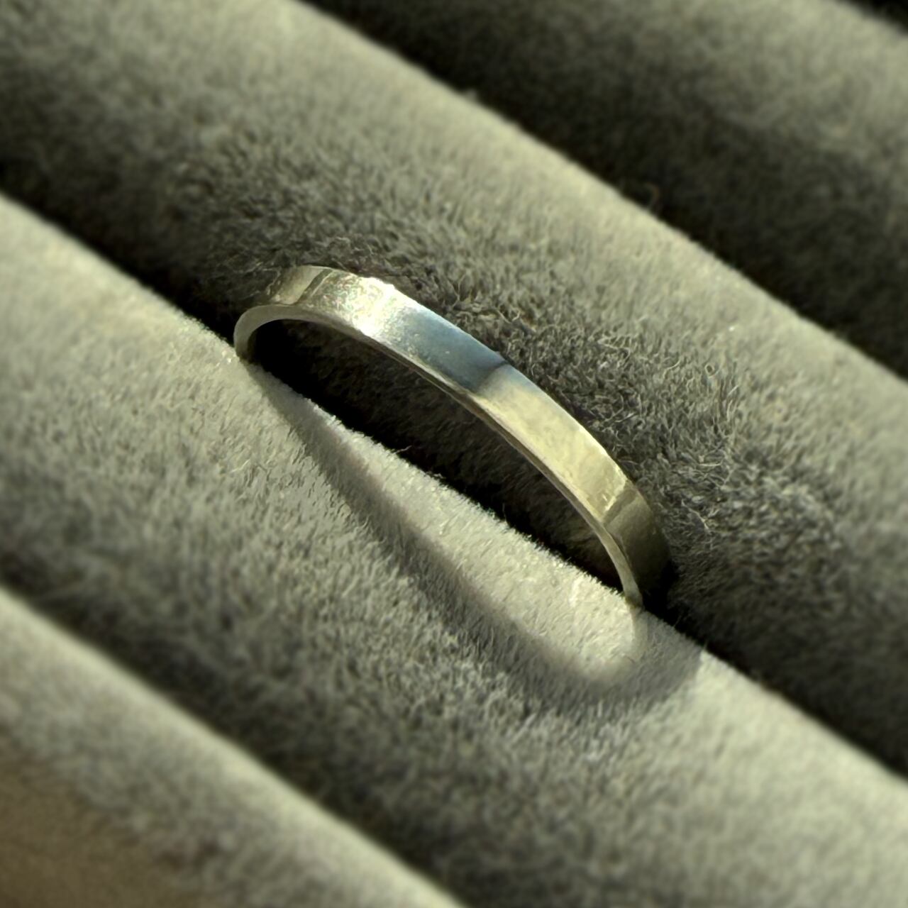 2mm幅・1mm厚の洋白(ようはく)平角線を使用し、シンプルで潔い平打ちリングに仕立てました。